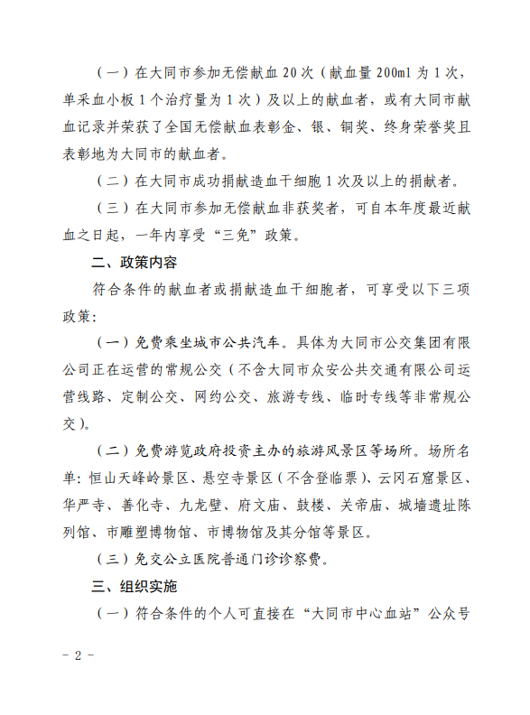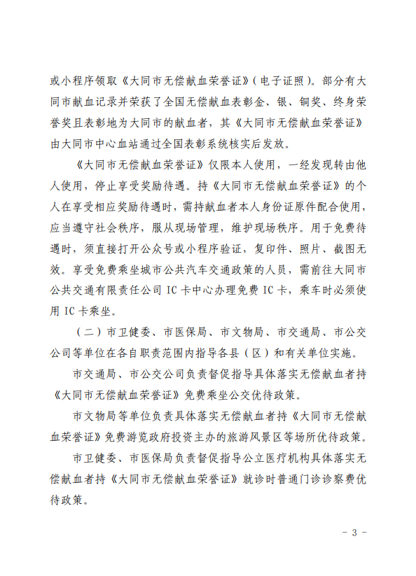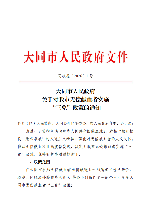 大同市人民政府关于对我市无偿献血者实施“三免”政策的通知